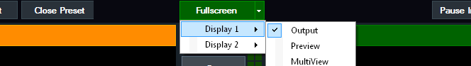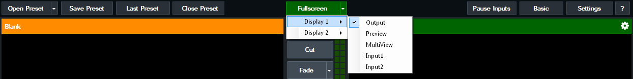 By default the Fullscreen will display the final mixed output of vMix. Click the arrow to the right of the Fullscreen button to select a different output option: