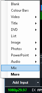 To add a Mix input, click the arrow next to Add Input in the main vMix window and click the Mix option.