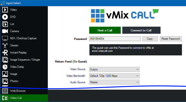 The input can also be closed in vMix, however it is possible to reuse the Password for subsequent calls in the future.