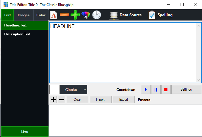 While the Live button is green, all text typed into the Title Editor window will update the title in real time.