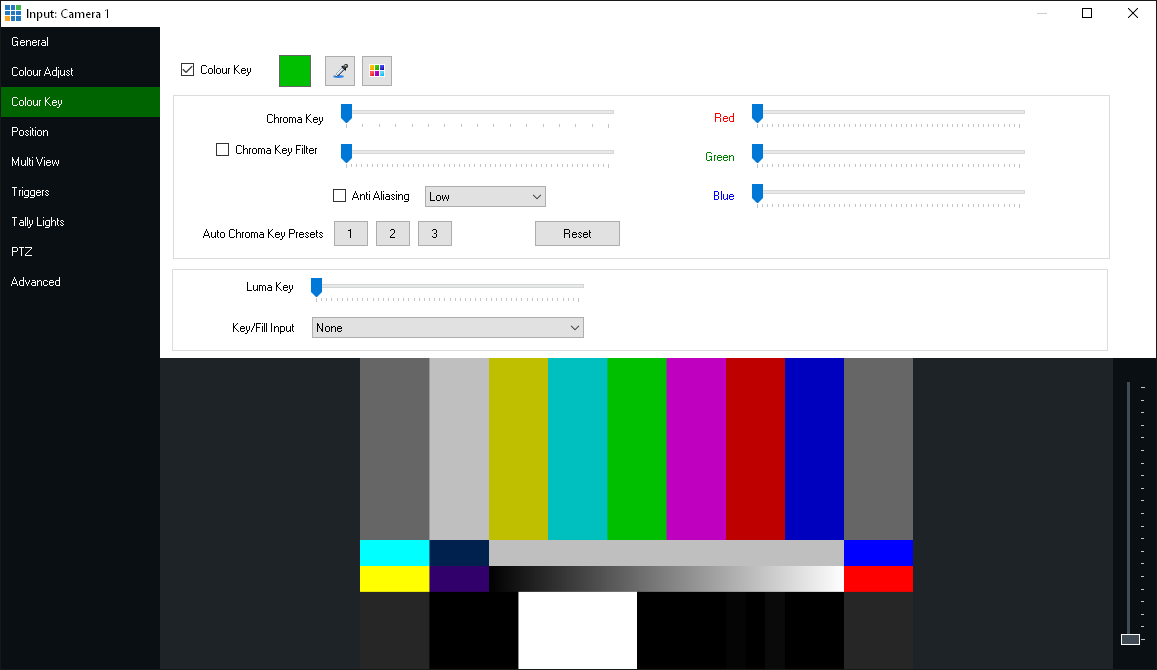 Tolerance: Set how close vMix should match to the Red/Green/Blue values in the colour key. The sliders all the way to the left represent an exact match.