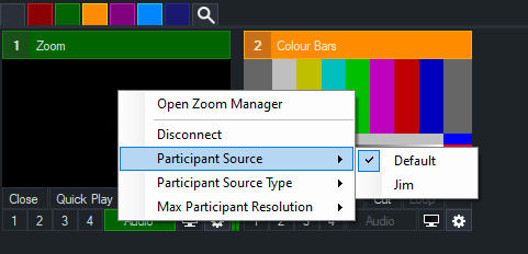 The Audio Source menu specifies what audio the input receives from Zoom: