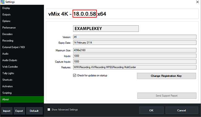 To check what version of vMix you are currently running, open vMix and select the "Settings" button at the top right and go to the "About" tab.