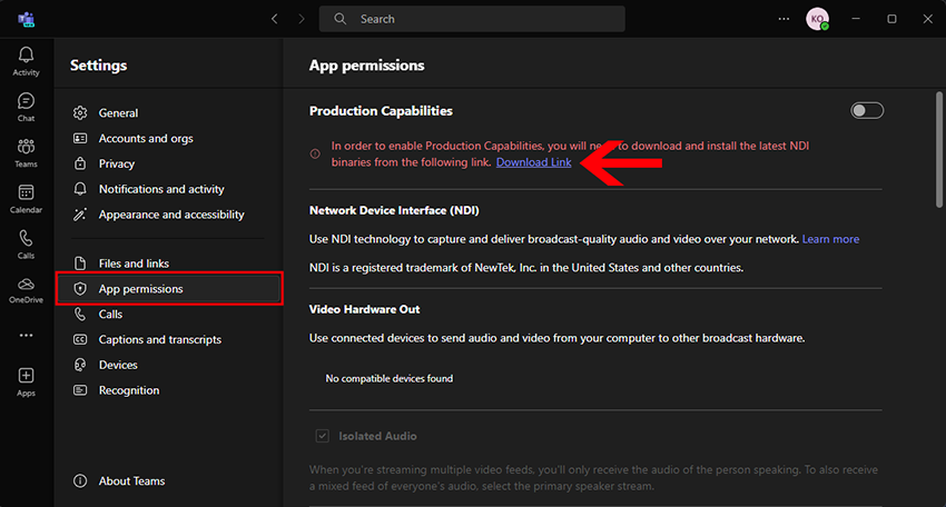 In the new window that appears, select the App Permissions tab. The ability to enable NDI is now included in the Teams "Production Capabilities" permissions. To enable, you will need to firstly download and install the latest NDI binaries from the link provided.