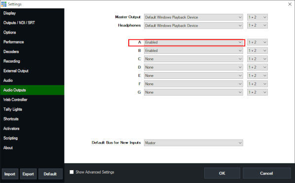 Next go to Settings -> Audio Outputs -> and set the Bus A option to Enabled. Then press OK.