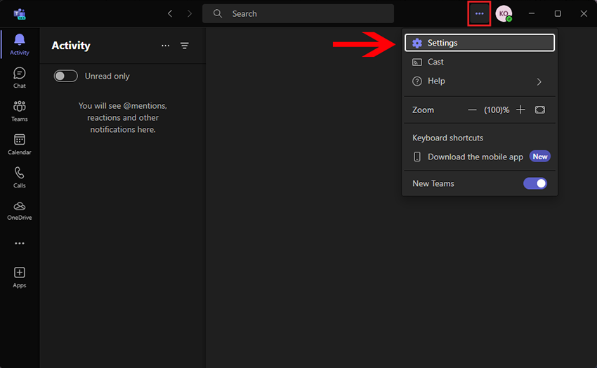 Next head to your Teams installation and click on the settings menu at the top right (3 dotted button). Then select Settings.