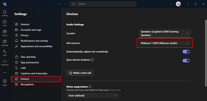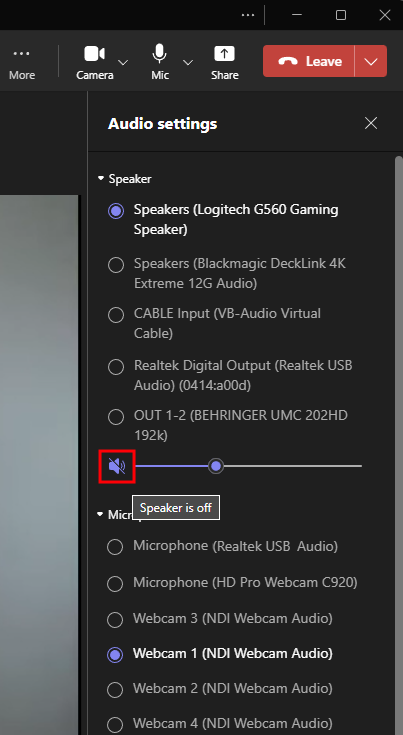 Microphone - select Webcam 1 (NDI Webcam Audio)