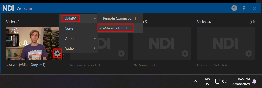The Webcam app supports 4 NDI virtual webcams. In this example, we will just configure NDI Webcam 1. Click the cog icon button under Video 1. Select your computer name. Then select the vMix - Output 1 option.