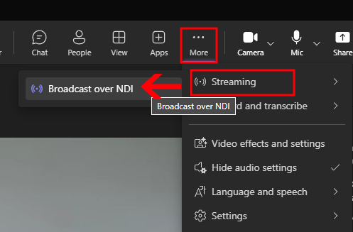 Finally, ensure you have enabled Broadcast over NDI. Click the More Settings button (3 dotted button), select Streaming and finally Broadcast over NDI.