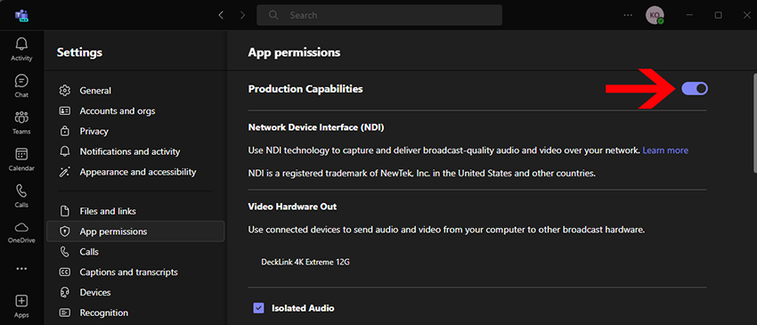 Once installed, return to the App Permissions section of the Teams settings. Toggle the button on to enable production capabilities which includes NDI.