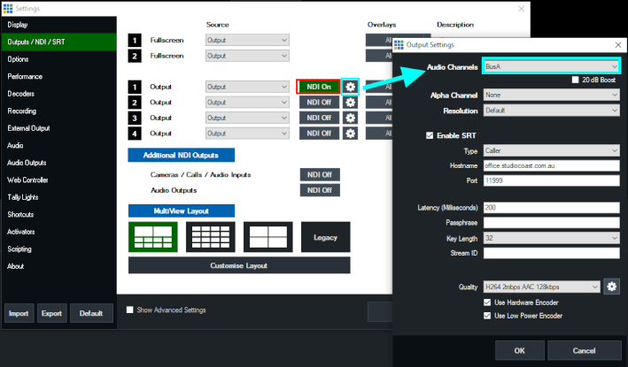 Next click the cog icon to the right of this and select BusA from the Audio Channels dropdown menu. This will enable the NDI output from vMix with BusA audio included. Using Bus A audio means we can control what audio is sent back to the Teams Caller - to avoid any audio feedback.