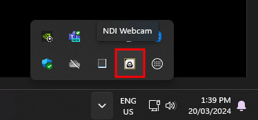 Open the NDI Webcam program that comes installed with the NDI Tools. Once running, click the arrow in the system tray at the bottom right of Windows and double click the yellow and black icon to open the NDI Webcam app.