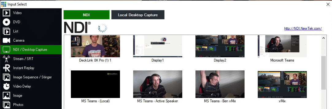 Open vMix and go to Add Input -> NDI / Desktop Capture -> NDI. Then select the Teams NDI output that you want to use in your production.