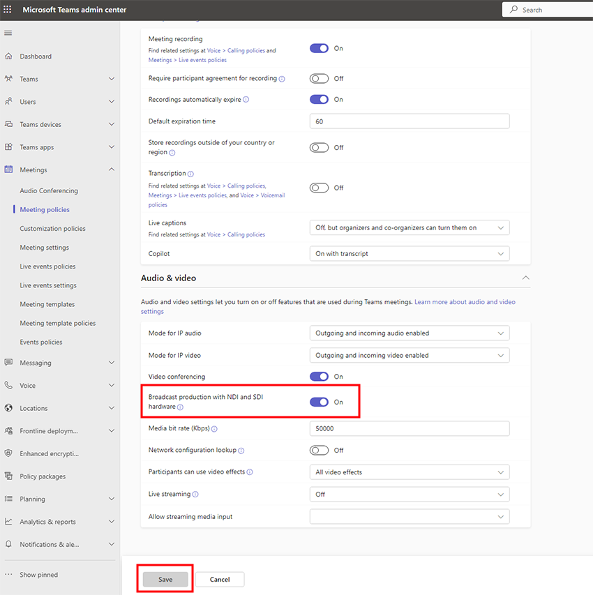 5) Scroll down to the Audio and Video section. Then enable the option for Broadcast production with NDI and SDI hardware then press Save.