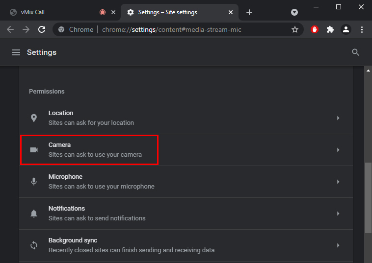 STEP 2. Scroll down to the Permissions section and select Camera.