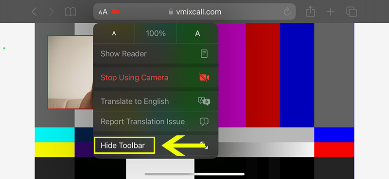 When using an iPhone in landscape mode, you may not be able to see the vMix Call menu at the bottom. Or it might be partially hidden. To fix this, you will need to hide the Safari browser toolbar.