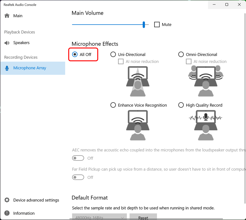 6. Now click on the ‘Microphone Array’ option and set the ‘Microphone Effects’ to ‘All Off’.