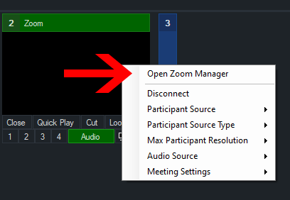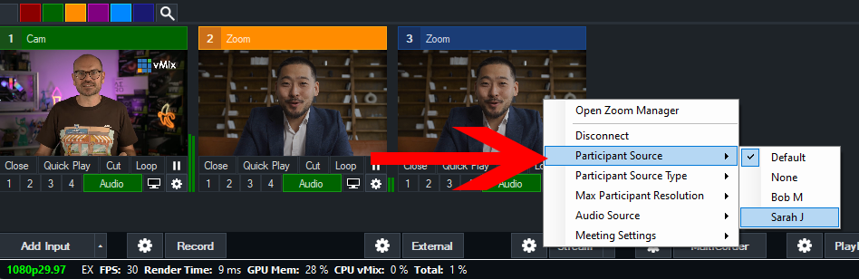 Once Zoom participants start joining we can see them either in the Zoom Manager window or by going to right click on any Zoom input in vMix and selecting Participant Source.