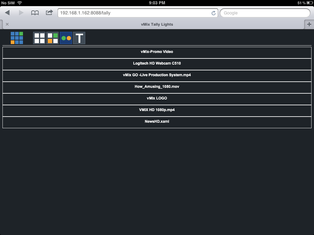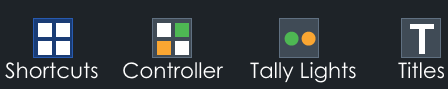The vMix Web Controller interface is a compact version of your actual vMix interface. It is compact so that it can be used on even the smallest of Smartphone screens. The interface has 4 different screens- Shortcuts, Controller, Tally Lights and Titles. These can be changed by clicking the icons along the top.