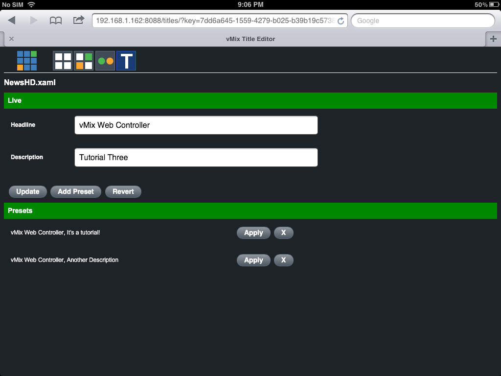 The fourth screen in the vMix Web Controller allows you edit vMix titles right from your tablet or phone! This means that you have someone controlling the titles completely separately from the vMix producer.