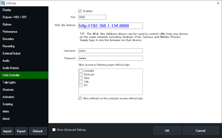Firstly, open up the settings section of vMix and click on the vMix Web Controller tab. Tick the top box to enable it. The default port for use is 8088. Only change this if you're an advanced user and understand network protocols.