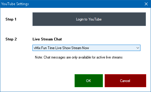 Click OK and being receiving live chat messages by clicking the ON button next to the YouTube icon.